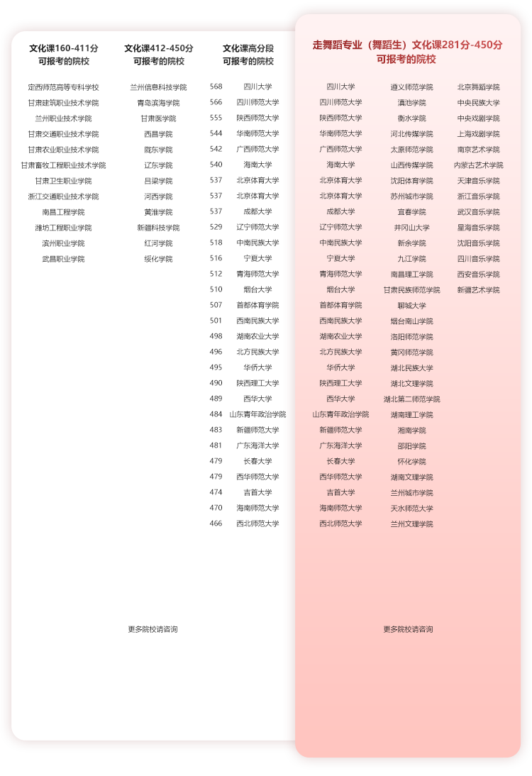 说明:甘肃舞研针对211/985院校或艺术类院校,开设省考、校考定向班,根据相应的考试内容,针对性教学。