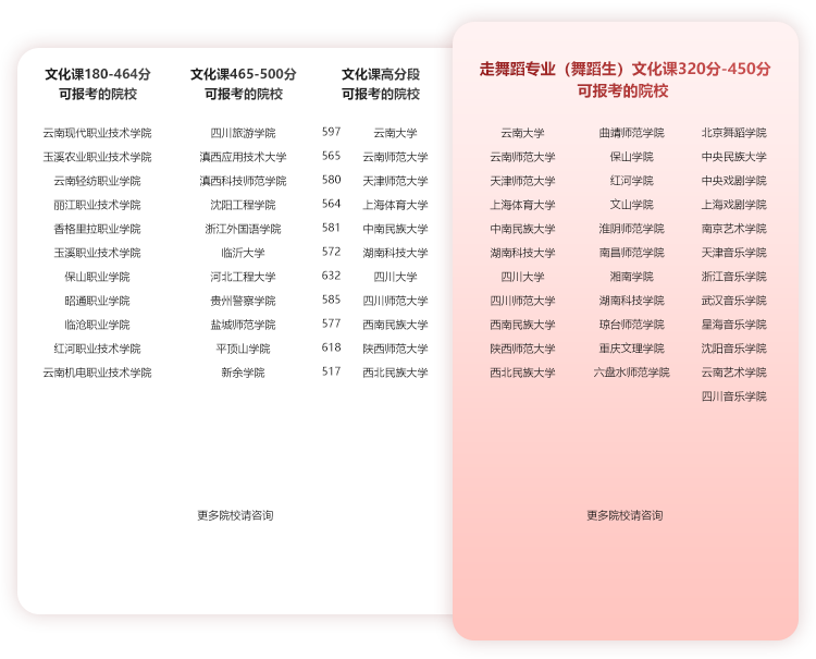 说明:各院校每年招生政策不同,承认省考院校会有所不同,了解最新考情信息可咨询舞研老师。